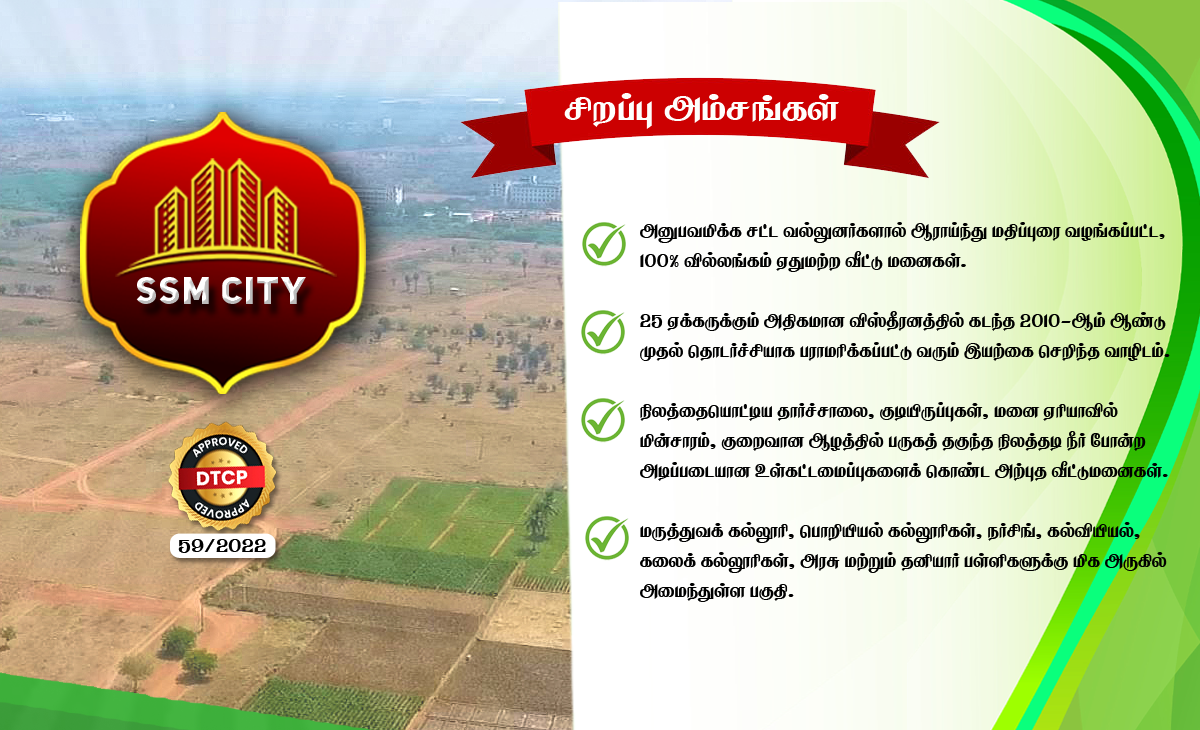 திருச்சி – சென்னை பைபாஸ் சாலையில் சத்திரம் பேருந்து நிலையத்திலிருந்து 21 கி.மீட்டரில், பைபாஸ் சாலையிலிருந்து 1 கி.மீட்டருக்கும் குறைவான தூரத்தில், கல்லூரிகளுக்கும் அரசுப் பணியாளர்கள் அதிகம் வசிக்கும் கொணலை ஊருக்கும் நடுவில், விரைவில் துவங்கவிருக்கும் மிகப்பெரிய தனியார் மென்பொருள் பூங்காவிற்கு எதிரில் அமைந்துள்ள எமது SSM CITY மனைப்பிரிவின் PHASE – 3 & 5 விரிவாக்கம் மற்றும் விற்பனை.